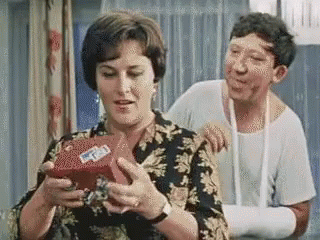 A woman receives a surprising gift from a man with a cast, a scene from the classic Soviet comedy 'The Diamond Arm'.