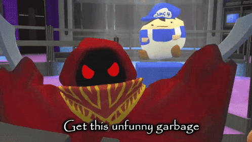 a cartoon character says get this unfunny garbage next to another character