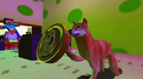 A 3D animated Doge holds a coin with another Doge's face, while Smg4's Steve character dances in a colorful room.
