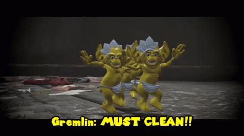 Two Smg4 gremlins dance energetically with the caption 'MUST CLEAN!!' displayed on screen.