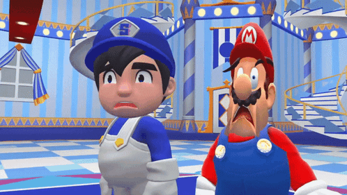 Smg4 Mario and SMG4 look confused in a brightly lit, blue and white themed room.