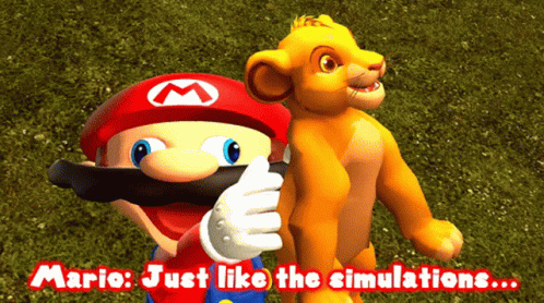SMG4 Mario gives a thumbs up next to Simba, remarking 'Just like the simulations...' in this animated scene.