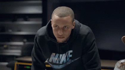 Stephen Curry, wearing a black Nike hoodie, looks intently at something with a serious expression.