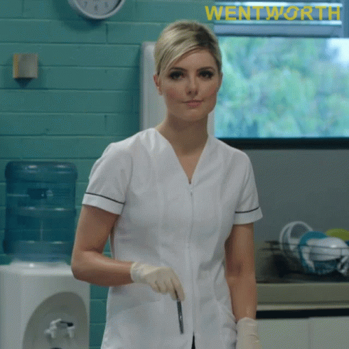 Maddy Jevic as Nurse Redcliffe from Wentworth, smiling in her uniform and gloves.