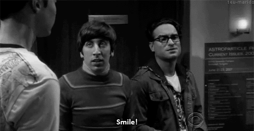 Sheldon Cooper attempts a forced smile while standing with his friends in a scene from The Big Bang Theory.