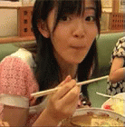 A cute young woman smiles while enjoying a meal of noodles with chopsticks.