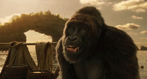 Chee-Chee the gorilla from Dolittle, voiced by Rami Malek, smiles widely on a boat with a scenic background.