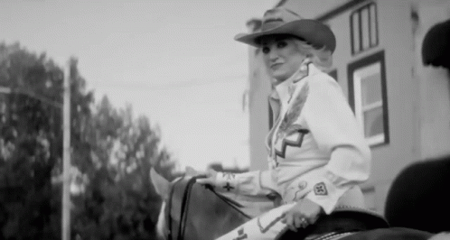 Tanya Tucker, the country music legend, smiles happily while riding a horse in a classic cowgirl outfit.