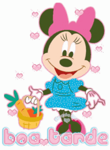 Minnie Mouse smiles brightly amidst pink hearts, holding a basket of carrots and wishing 'Good Afternoon'.