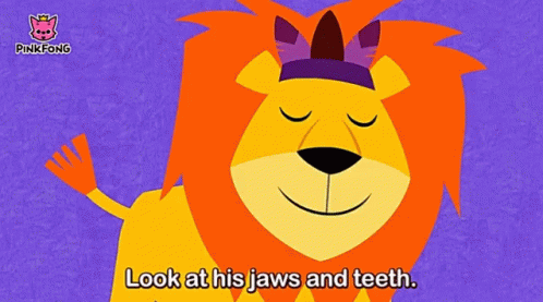Pinkfong's cartoon lion shows off its big, sparkling smile and teeth, a fun moment for kids.