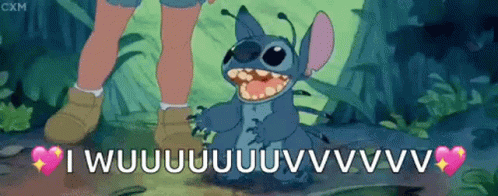 Stitch from Lilo & Stitch bursts into a hilarious, wide-mouthed laugh, showing his big smile and excited expression.