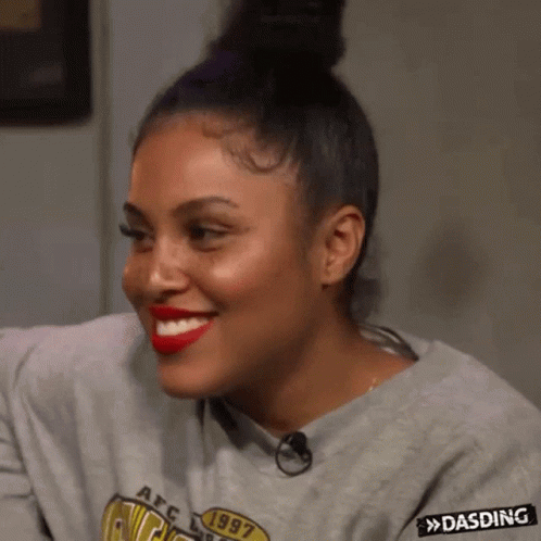 Woman with red lipstick and gray sweatshirt smiles with a surprised expression.