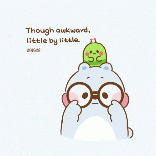 Tonton Friends cartoon bear with glasses and a caterpillar on its head, with the text 'Though awkward, little by little'.