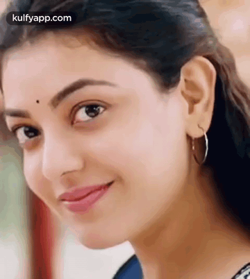 Kajal Aggarwal's beautiful smile captured in a close-up, showcasing her elegant hoop earring and bindi.