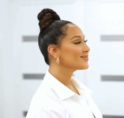 Adrienne Bailon, with her hair in a bun and wearing a white shirt, smiles beautifully at the camera.