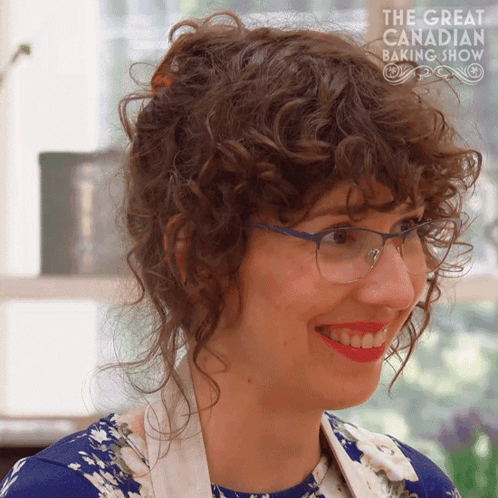 Heather, a woman with curly hair and glasses, smiles during The Great Canadian Baking Show.