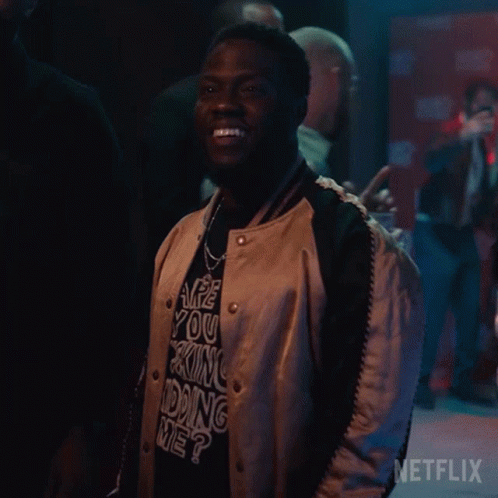 Kevin Hart smiling and looking at the camera, wearing a jacket over a t-shirt that says "ARE YOU LOOKING ME?".