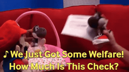 Black Yoshi and Mario puppets on a red couch, celebrating receiving a welfare check, with text overlay 'We Just Got Some Welfare! How Much Is This Check?'