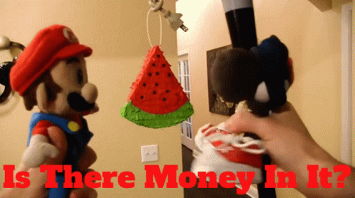 Black Yoshi and Mario examine a watermelon pinata, wondering 'Is There Money In It?'