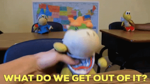 Bowser Junior from SML (SuperMarioLogan) asks 'What do we get out of it?' in a puppet show scene.