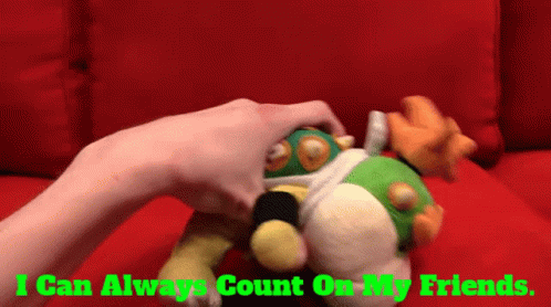 A hand holds a Bowser Junior plush toy on a red couch, with the text 'I Can Always Count On My Friends' displayed.