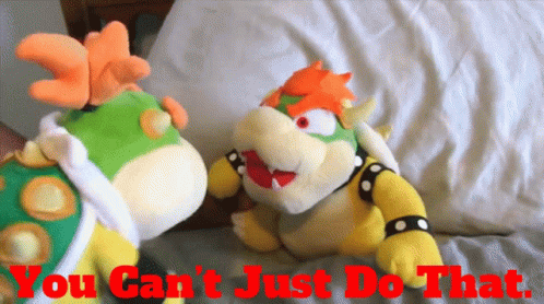 Bowser Junior and Bowser plush toys on a bed, with the text 'You Can't Just Do That' displayed.