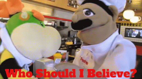 Bowser Junior plush toy in a diner setting, asking the profound question: 'Who Should I Believe?'