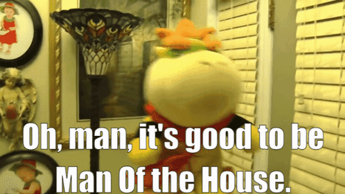 Bowser Junior puppet proudly declares, "Oh, man, it's good to be Man Of the House."