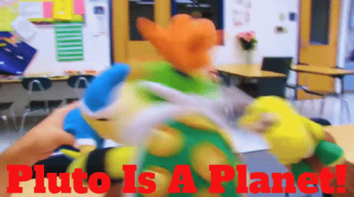 SML's Bowser Junior plush toy in a classroom with a 'Pluto Is A Planet!' sign.