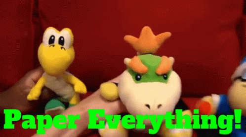 SML's Bowser Junior, Koopa Troopa, and Kamek plush toys on a red couch with 'Paper Everything!' text overlay.