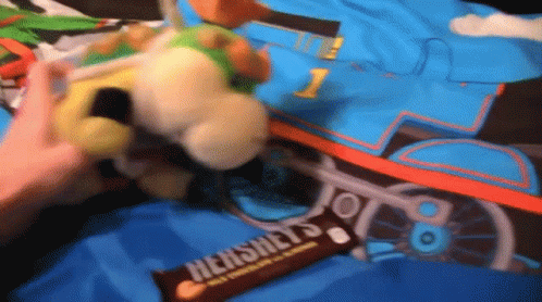 Sml Bowser Junior plush toy on a blue bed next to a Hershey's Milk Chocolate with Almonds bar.