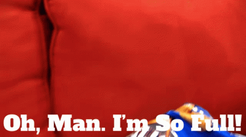 SML's Bowser Junior plush toy sits on a couch amidst spilled mac and cheese and Doritos, declaring 'Oh, Man. I'm So Full!'