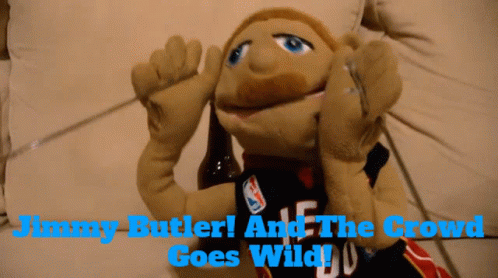 SML's Brooklyn Guy puppet, wearing a Miami Heat jersey, celebrates Jimmy Butler with an on-screen text overlay.