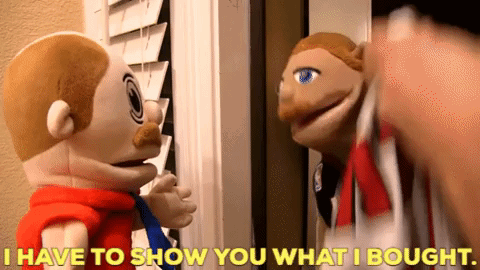 SML's Brooklyn Guy excitedly tells another puppet, 'I have to show you what I bought.'