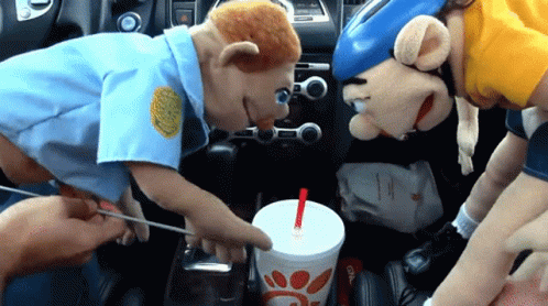 SML's Brooklyn Guy puppet drinking from a cup in a car, with another puppet watching.
