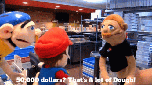 SML's Brooklyn Guy, Mario, and another puppet discuss 50,000 dollars in a pizza kitchen, exclaiming 'That's A lot of Dough!'