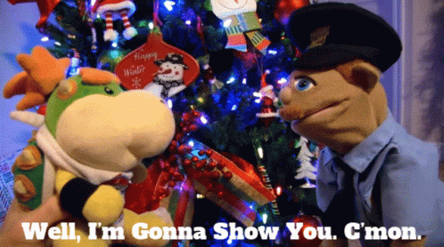 Sml Brooklyn Guy puppet talks to another puppet in front of a Christmas tree, saying 'Well, I'm Gonna Show You.'