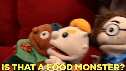 SML's Cody and friends on a red couch, asking if something is a food monster.