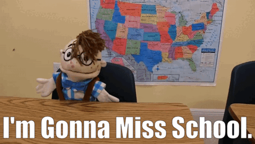SML's Cody puppet expresses sadness about missing school, sitting at a desk with a US map in the background.