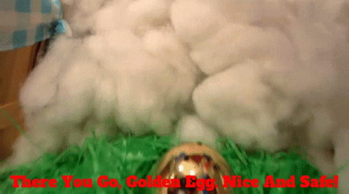 The SML Easter Bunny carefully places a golden egg into a nest of green grass, ensuring it is nice and safe.
