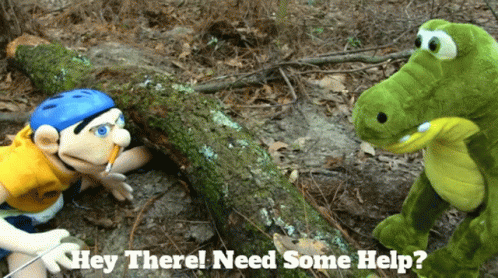 SML puppet and goofy alligator puppet interact in the woods, with the alligator asking 'Need Some Help?'