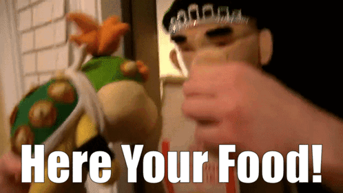 SML's Jackie Chu character presents food with the text 'Here Your Food!' displayed on screen.