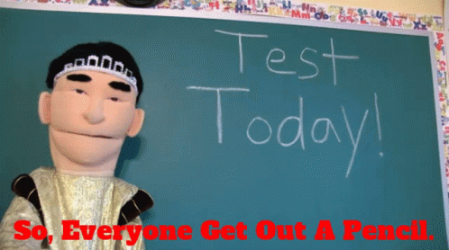 Jackie Chu, the SML puppet, stands before a chalkboard announcing a test and instructing everyone to get out a pencil.
