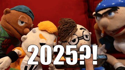 SML's Jeffy and other puppet characters react with surprise to the year 2025 displayed on screen.