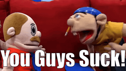 SML's Jeffy and another puppet on a red couch with the text 'You Guys Suck!' displayed.
