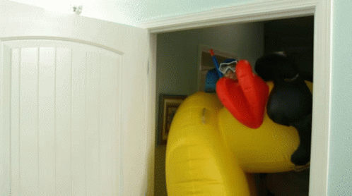 SML Jeffy, wearing a snorkel and mask, is seen on a large inflatable duck as Mario and Peach look into a closet.