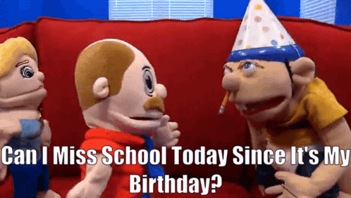 Jeffy from SML asks if he can miss school for his birthday, while sitting on a red couch with other puppets.