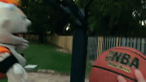 SML's Jeffy puppet attempts a basketball dunk outdoors, holding the ball near the hoop.
