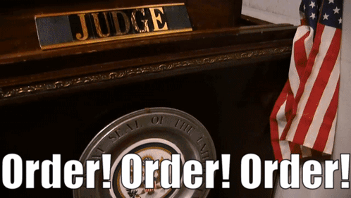 Sml Jeffy puppet acts as a judge, banging a gavel and shouting 'Order! Order! Order!' in a courtroom setting.