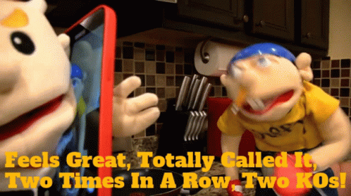 SML's Jeffy puppet, wearing boxing gloves and a pencil in his nose, celebrates two KOs in a row, exclaiming 'Feels Great, Totally Called It!'